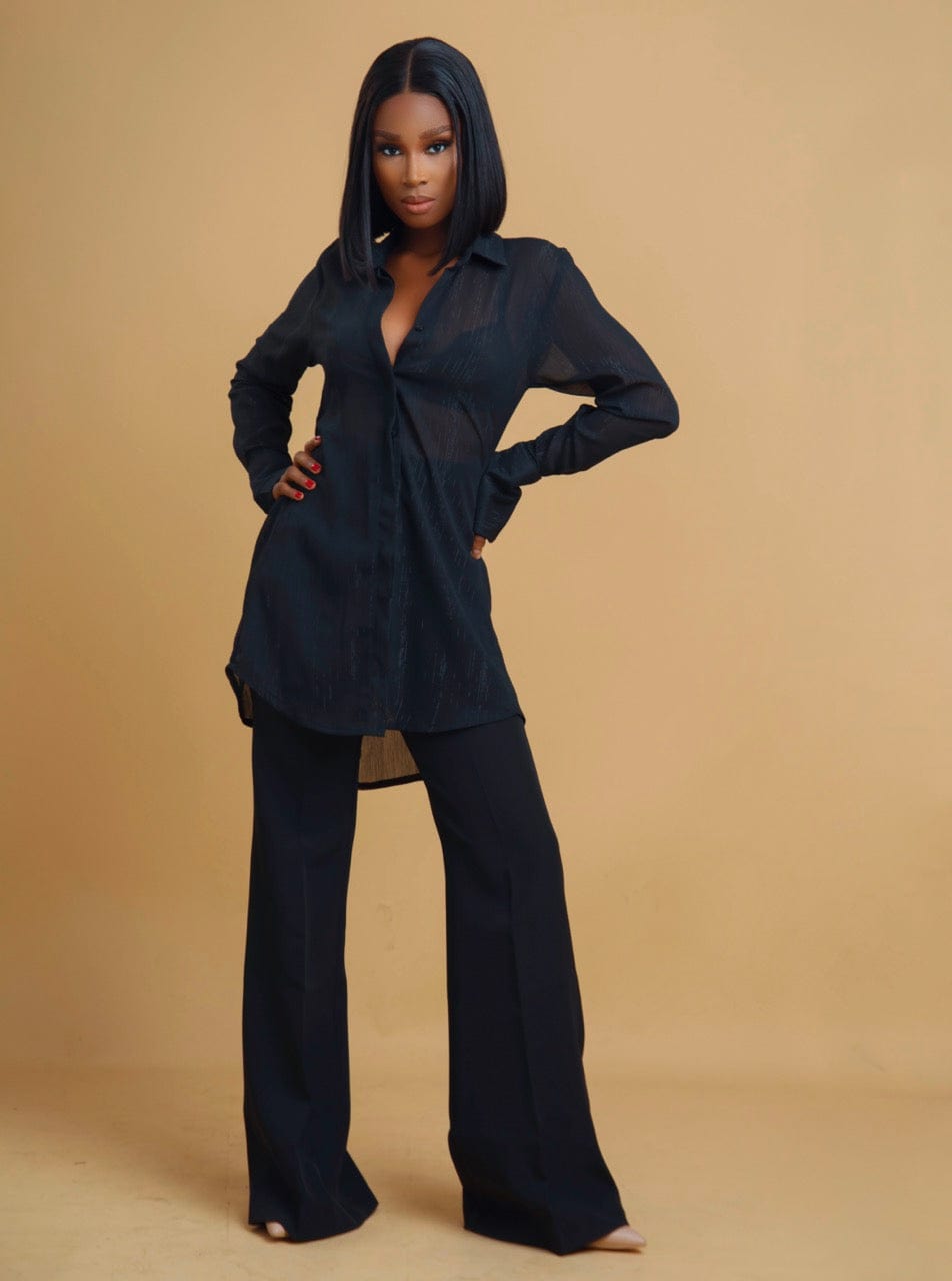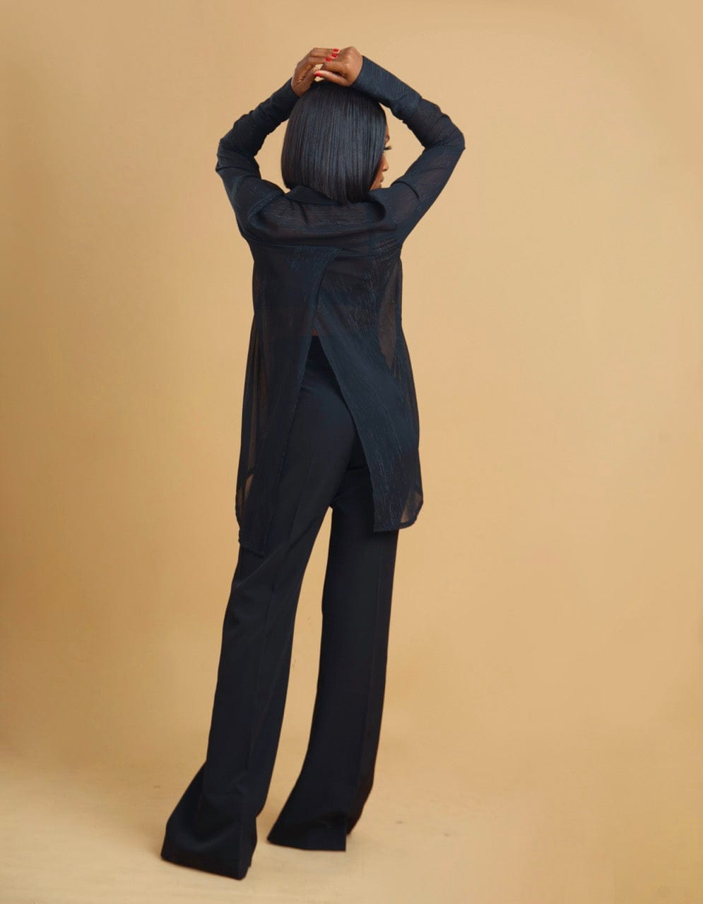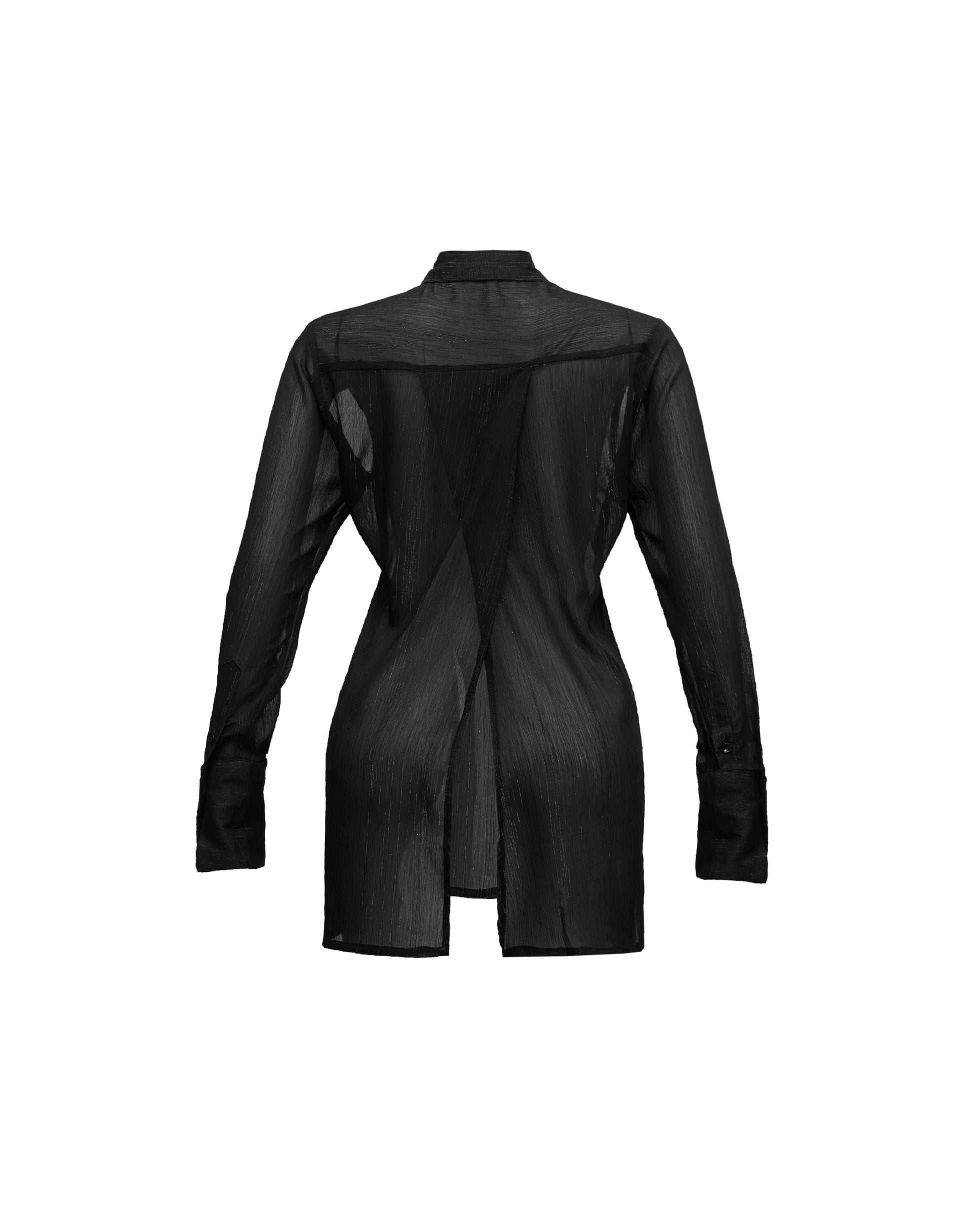 The CADI SHIRT is a captivating blend of sensuality and sophistication finished with a sheer fabric. This shirt features a stylish back cut-out overlay. The long cuffs create a refined and polished look, making it a versatile piece for both casual and dressy occasions. Pair this shirt with the ALEXA pants for a finished classy look.