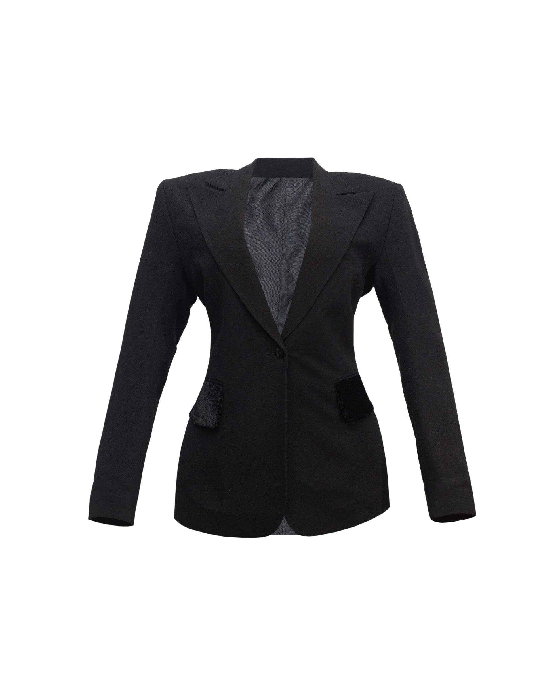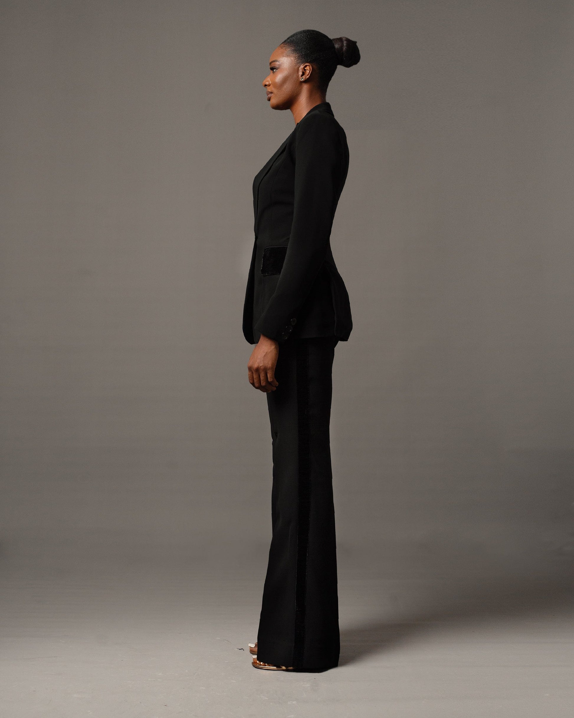 The KANEN BLAZER is a single-breasted, shoulder padded, hip-length blazer; with an opulent velvet pocket flap that adds a touch of luxurious detail. The design has a double vent which enhances comfort and movement. This timeless piece effortlessly transitions from day to night and is a statement piece for any occasion. It pairs perfectly with its matching KANEN Pant which is adorned with velvet side stripes.