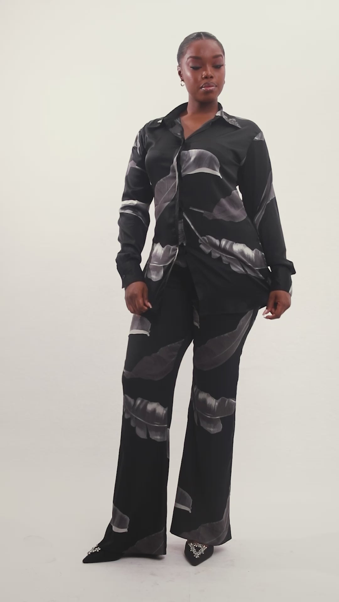 The NAYA PANTS is the perfect silk finish layer that spells sophistication. Designed in a plush silk-feel fabric with a delicate leaf print, these pants are a celebration of style and comfort and will have you feeling and looking intentional about your style. It features a high rise, front zipper with hook, and a very subtle bell-bottom leg cut. Complete this look with our matching NAYA SHIRT for a comfortable everyday look.