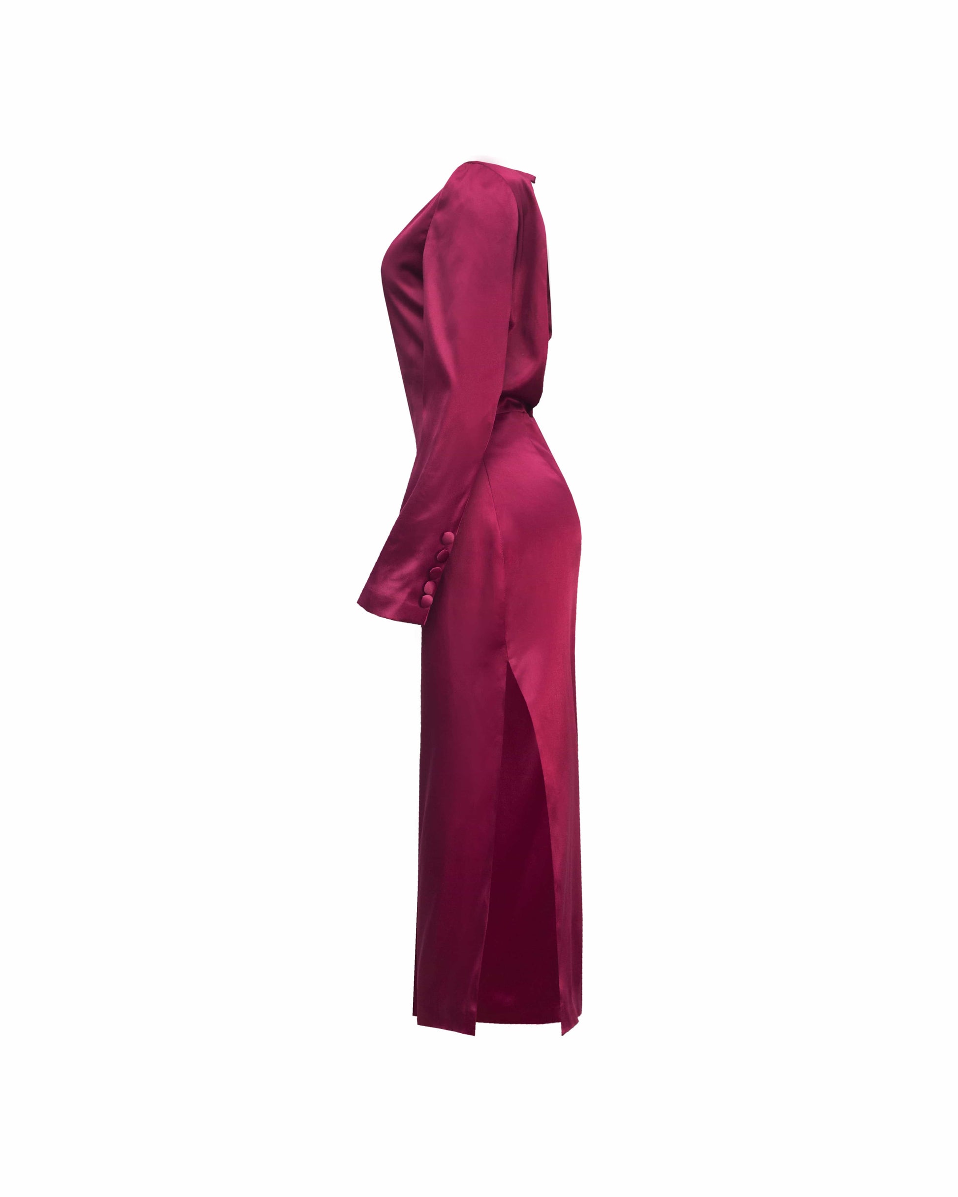 The SLEEK DRESS is a striking fusion of sophistication and contemporary flair. Made from a plush satin fabric, this dress features strategically placed shoulder padding, Long Sleeve with buttoned wrist, a back cut-out, and a single side slit that offers a hint of modernity and elegance. Crafted with meticulous attention to detail, this dress is a statement piece.