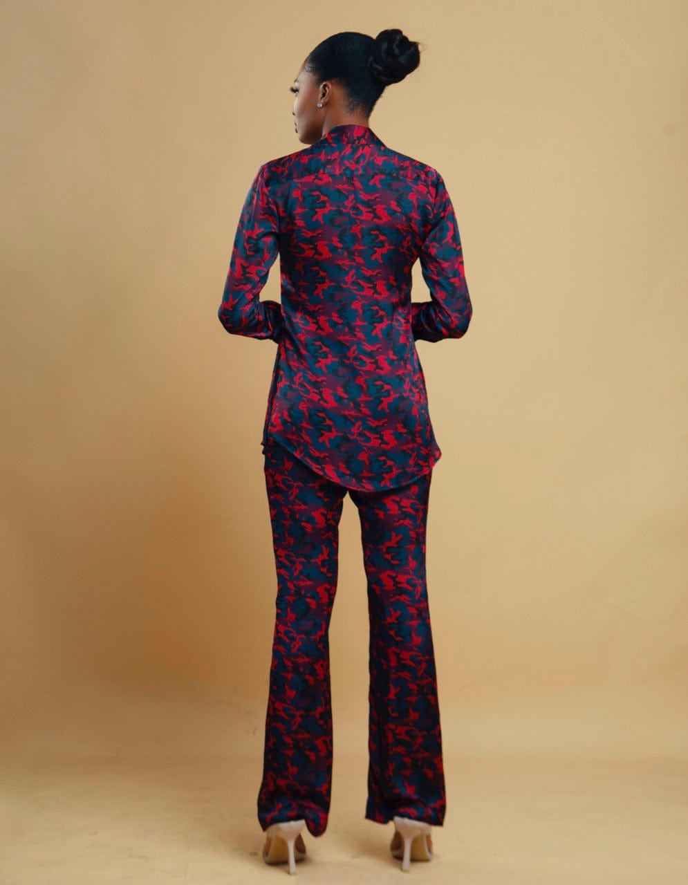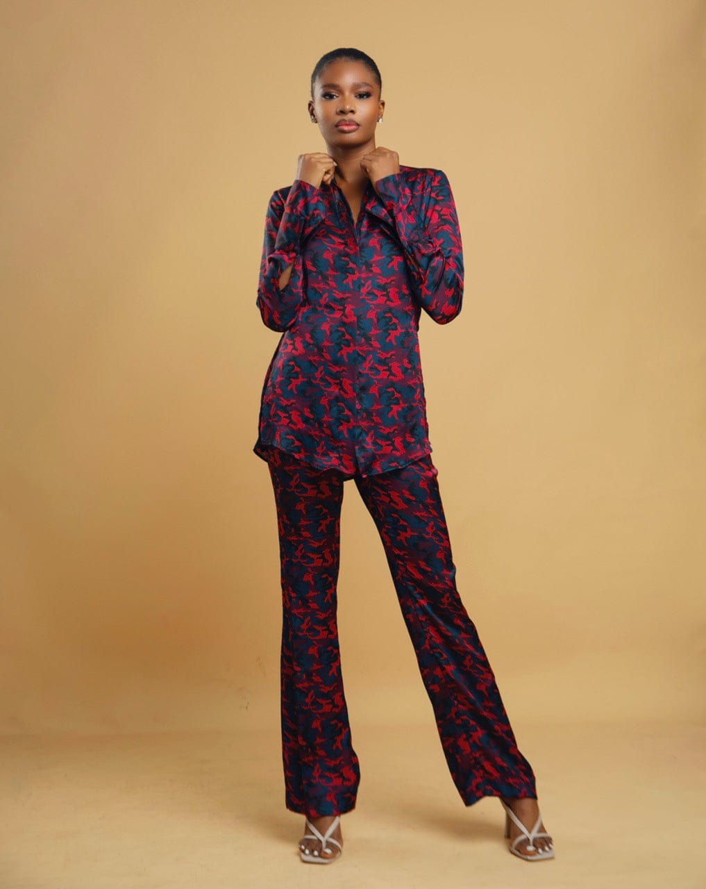 The TIANA CO-ORD is the perfect silk finish fabric layer in camouflage print. Designed in a plush silk-feel fabric, this coord is a celebration of style and comfort and will have you feeling and looking intentional about your style. It features a hidden button closure and a waist- high side slits. it also features a classic signature double cuffs that spells sophistication. the TIANA CO-ORD is a perfect match and perfect for a comfortable, elevated everyday look.
